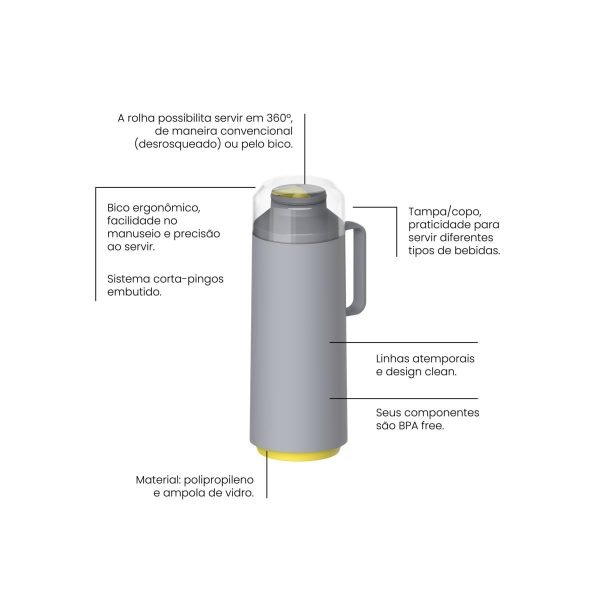 Ficou muito mais fácil consumir sua bebida preferida no decorrer do dia. Mas para isso, utilize a garrafa térmica Tramontina Exata em plástico cinza com ampola de vidro 1 litro. Produzida para conservar a temperatura de bebidas quentes e frias, a garrafa conta com ampola de vidro e corpo em polipropileno com design moderno, simples e leve, o que a torna fácil de transportar, utilizar e armazenar. Seu bico é ergonômico com rolha que garante maior precisão na hora de servir, podendo ser em 360 graus ou de maneira convencional, pelo bico e utilizando sua tampa como copo. Com a Tramontina, sua rotina fica muito mais prática e deliciosa!