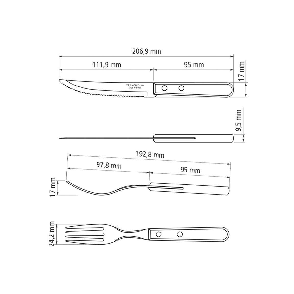 São 12 peças produzidas com cabo de madeira natural e rebites de alumínio, as lâminas das peças são em aço inox e possuem características que as tornam a melhor escolha para servir à mesa. As facas têm maior durabilidade do fio devido ao tratamento térmico e os garfos contam com lâminas com maior espessura e uma estampagem do aço que garante maior resistência.