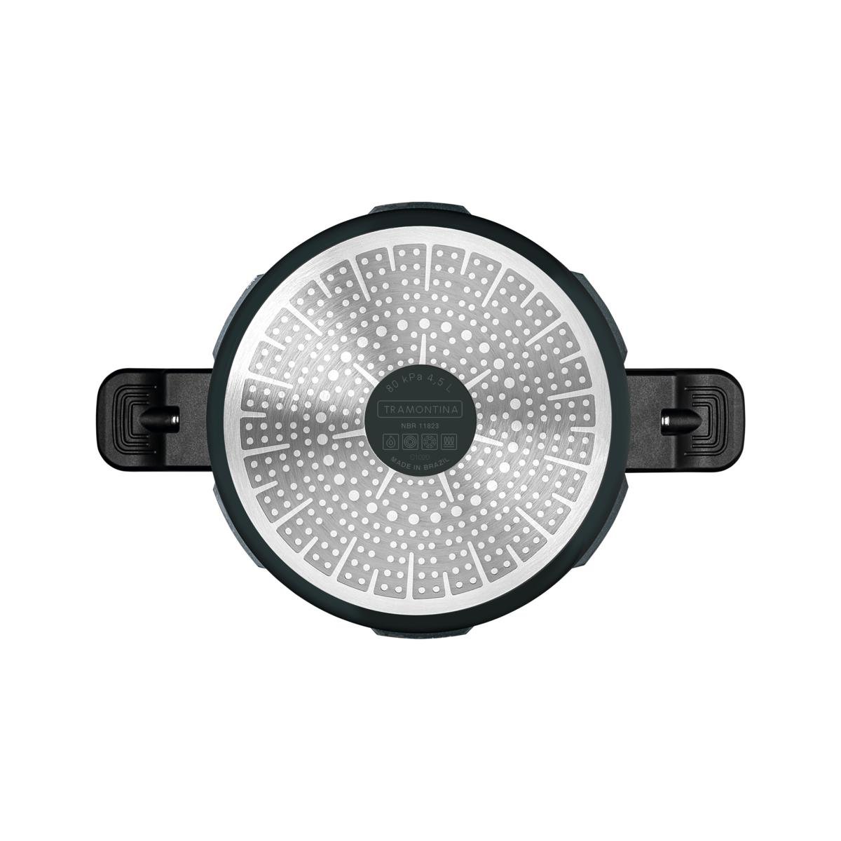 Um item essencial para garantir praticidade para o preparo das suas refeições, é sem dúvida, a panela de pressão Tramontina Torino em alumínio com revestimento interno e externo cerâmico verde petróleo 20 centímetros 4,5 litros. Ela é perfeita para a hora de preparar aquele delicioso feijão para seu almoço do dia a dia, pois conta com corpo de alumínio com espessura de 4 milímetros, que torna o cozimento dos alimentos mais rápido e uniforme. Seu revestimento é cerâmico e vem com tampa de alumínio com acabamento externo polido e interno satinado, com travas que oferecem maior segurança durante sua utilização. Suas alças são em baquelite antitérmico, material que reduz a propagação de calor e oferece maior segurança e conforto durante o manuseio. Ela ainda pode ser utilizada em fogões a gás, elétricos, vitrocerâmicos e indução, o que garante maior versatilidade na cozinha. Escolha Tramontina e garanta experiências inesquecíveis na hora de cozinhar!